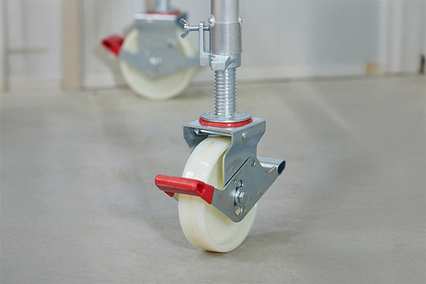 Die einzeln gebremsten Rollen sind bis zu 27 cm höhenverstellbar.Dadurch steht das Gerüst auch auf unebenen Flächen sicher und stabil.