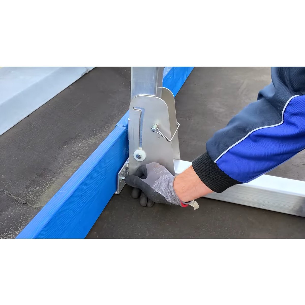 Das innovative Klick-Scharniersystem gewährleistet eine zuverlässige Verriegelung der Arbeitsbereiche und ermöglicht ein einfaches Hochklappen des Dachkantenschutzes bei Arbeiten vor Ort. Dank der flexiblen Aluminiumkupplung können die Handlaufteile variabel verbunden werden, sodass keine individuellen Anpassungen notwendig sind und eine direkte Endmontage erfolgen kann.