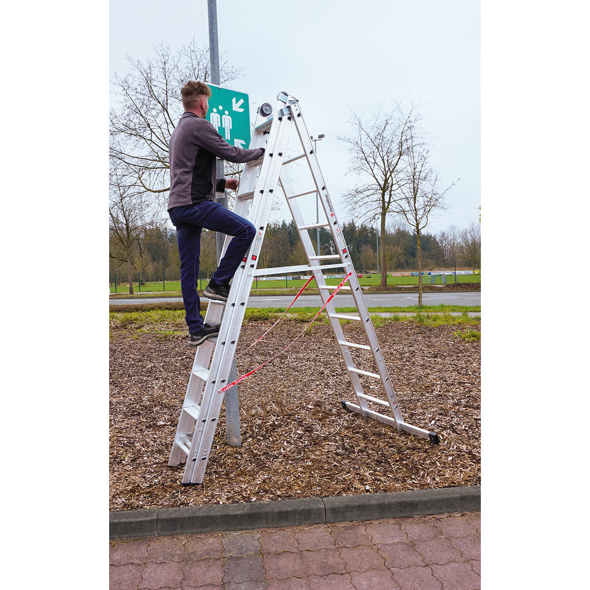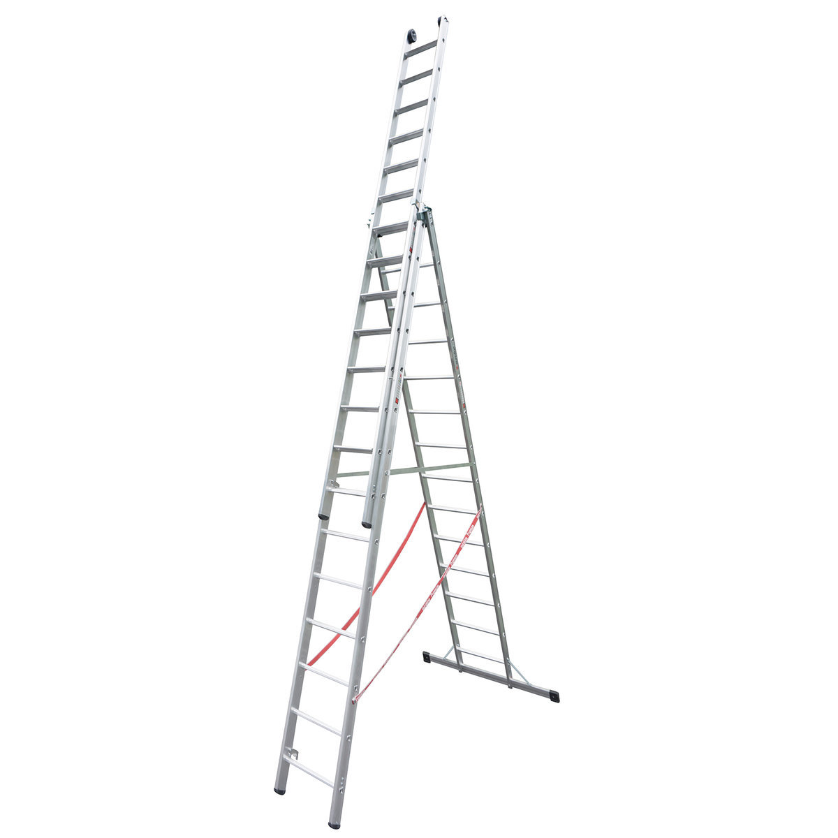 Diese 3-teilige Mehrzweckleiter ist aufgrund Ihrer vielfältigen Nutzungsmöglichkeiten als Anlegeleiter, Schiebeleiter als auch einfache Stehleiter oder auch Stehleiter mit Stufen-Aufsteckteil für den Profi-Einsatz in nahezu jedem Innen- und Außenbereich einsetzbar. Ob bei Reparaturen, Reinigungs- oder Handwerksarbeiten: erhältlich in verschiedenen Größen und mit einer stabilen Quertraverse versehen, bildet diese Leiter die ideale Steighilfe für das Arbeiten in den verschiedenen Höhen. Durch das leichte Gewicht ist sie auch in den größeren Größen noch leicht zu transportieren oder umzusetzen.