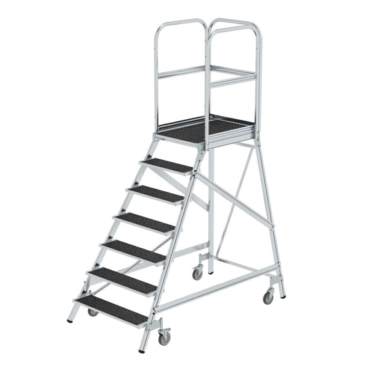 Podesttreppe eins. begehbar mit Federrollen Korundbeschichtung R13