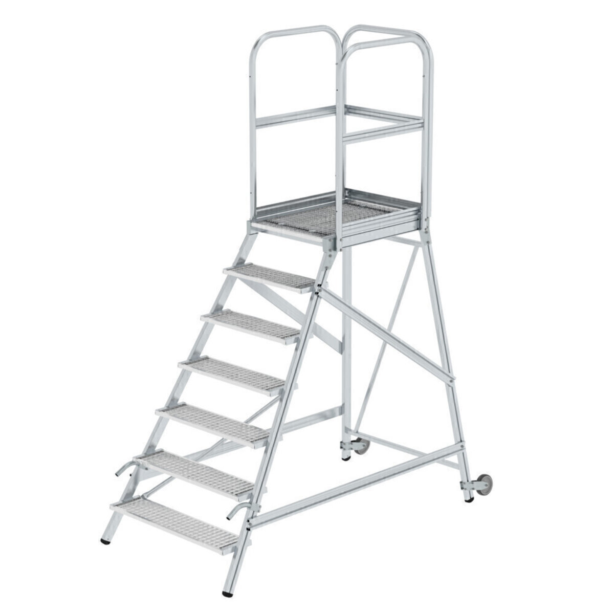Podesttreppe eins. begehbar mit Rollen und Griffen Stahl-Gitterrost