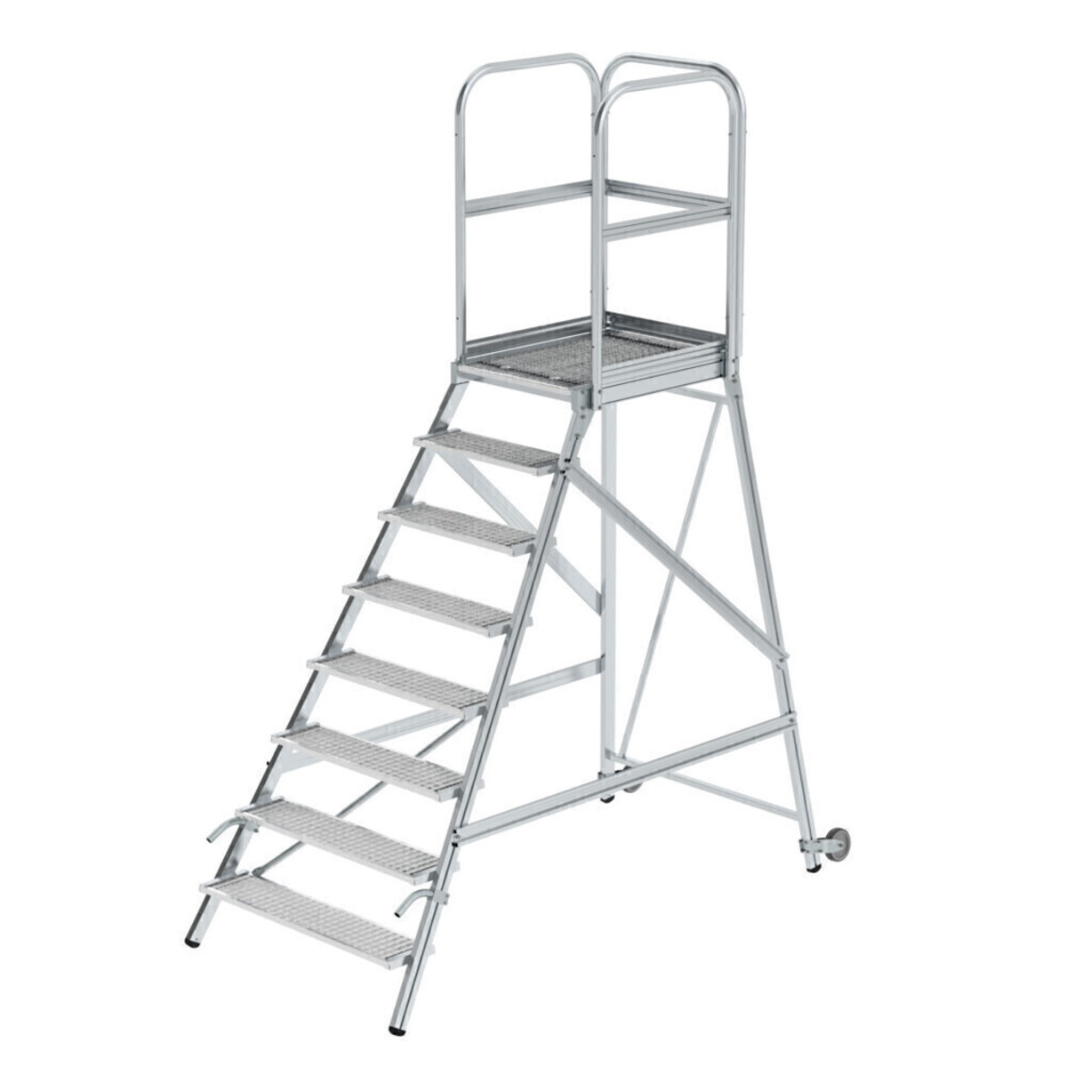 Podesttreppe eins. begehbar mit Rollen und Griffen Stahl-Gitterrost