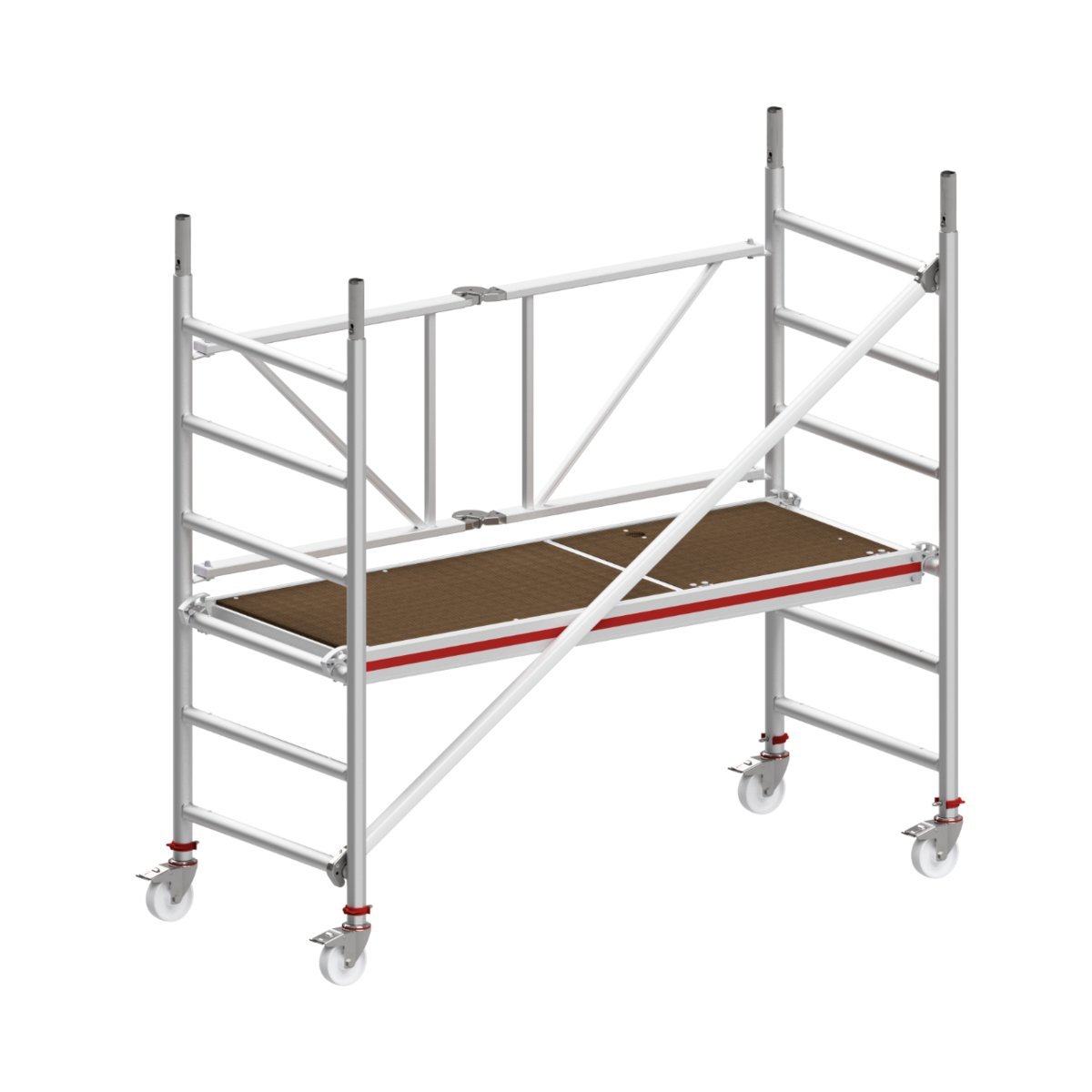 Das Klappgerüst 8177 ist je nach Einsatzbereich modular erweiterbar: als ingliedriges Fahrgerüst von der kleinsten Einheit mit Reichhöhe 2,80 m bis hin zu einer Konstruktion mit Reichhöhe 8,75 m. Die Bauteile lassen sich ohne Werkzeuge zum Gerüst zusammensetzen. Unabhängig davon, wie viele zusätzliche Teile beim Anbau benötigt werden, sind die Hymer-Fahrgerüste mit Sicherheitsaufbau sehr stabil. Der robuste Aufbau und die geräumige Bühne ermöglichen sicheres und ergonomisches Arbeiten auch bei maximaler Gerüsthöhe. Dazu tragen die speziell vom Hersteller entwickelten, patentierten Bajonett-Ausleger bei. Die Ausleger sind ab einer Reichhöhe von 4,57 m im Lieferumfang verpflichtend enthalten.