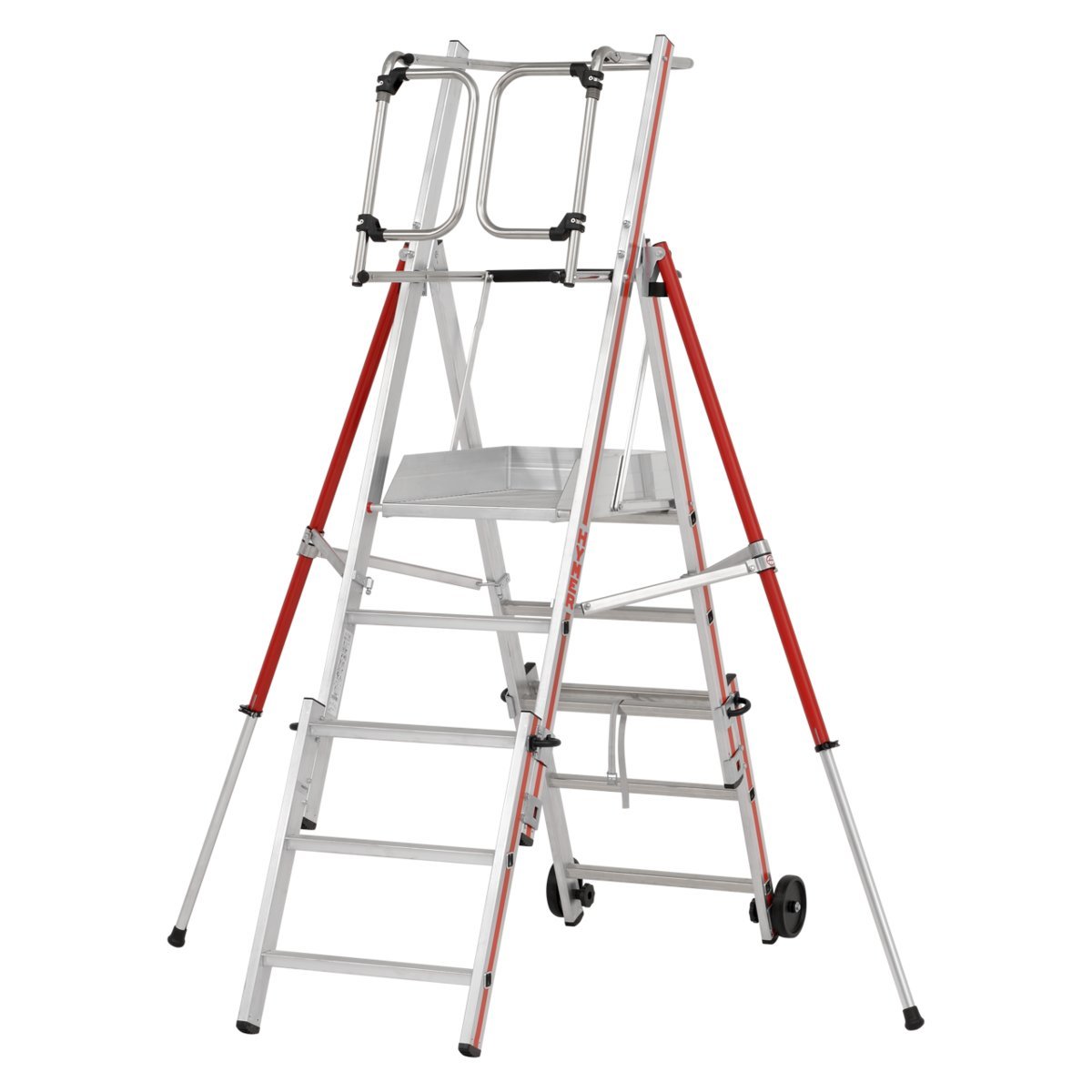 ∙ Sicheres, freihändiges Arbeiten durch Geländer und Knieleiste auf allen Seiten.