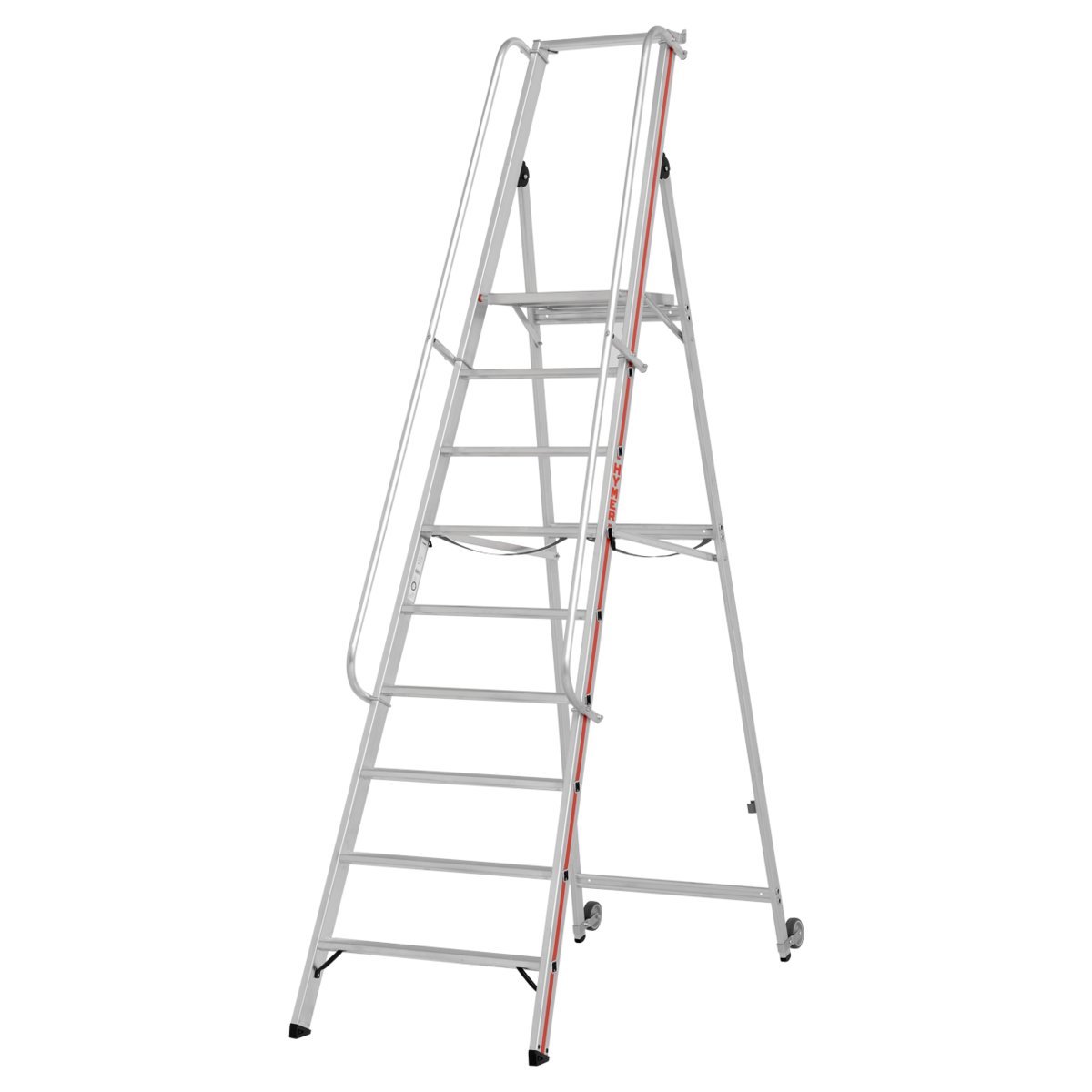 Plattformleiter mit Kipprollen und langem Handlauf