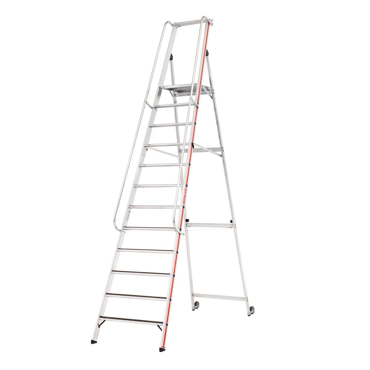 Plattformleiter R13 mit Kipprollen und langem Handlauf