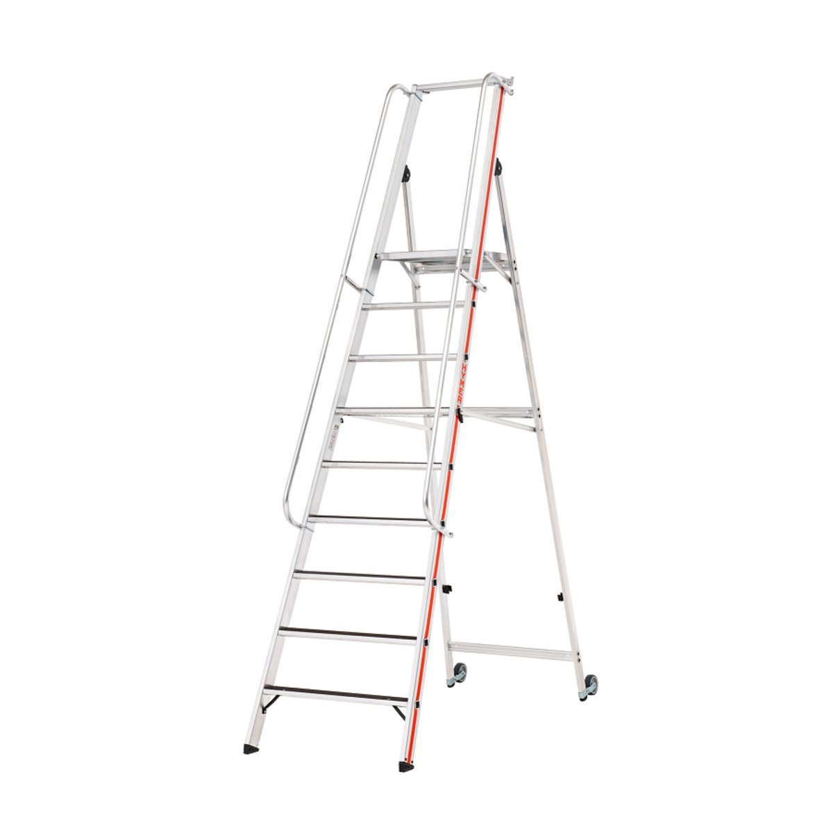 Plattformleiter R13 mit Kipprollen und langem Handlauf