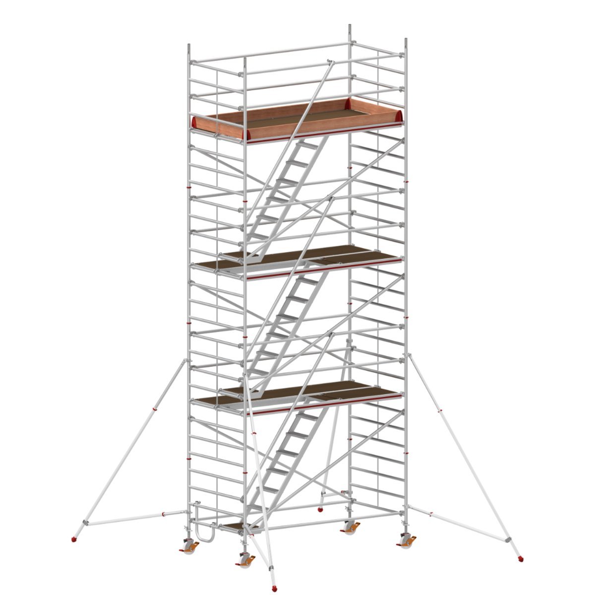 ∙ Schneller Auf- und Abbau durch massive Klickverschlüsse an Streben und Diagonalen und noch sicherer durch die in jeder Etage eingehängten Treppen.