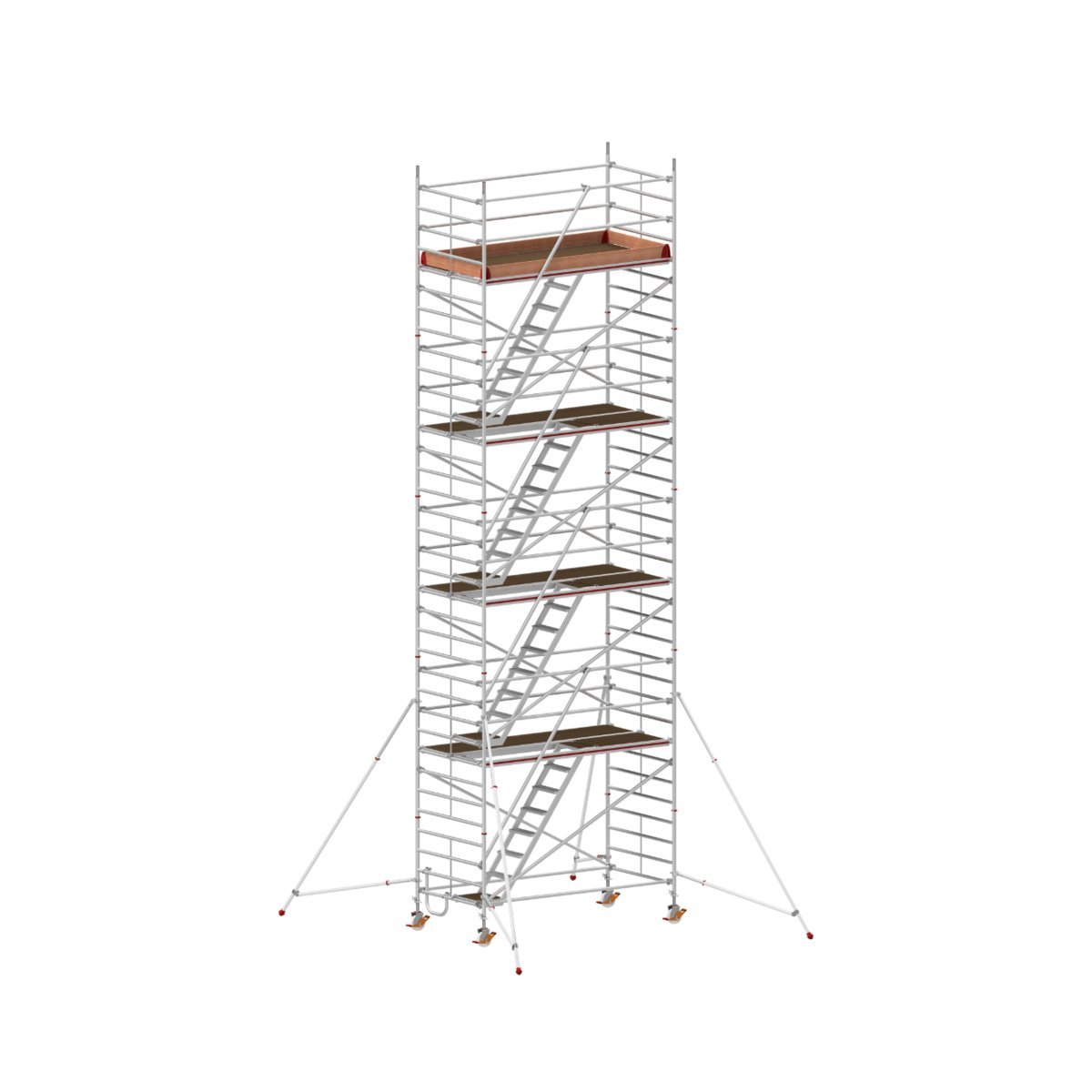 ∙ Schneller Auf- und Abbau durch massive Klickverschlüsse an Streben und Diagonalen und noch sicherer durch die in jeder Etage eingehängten Treppen.