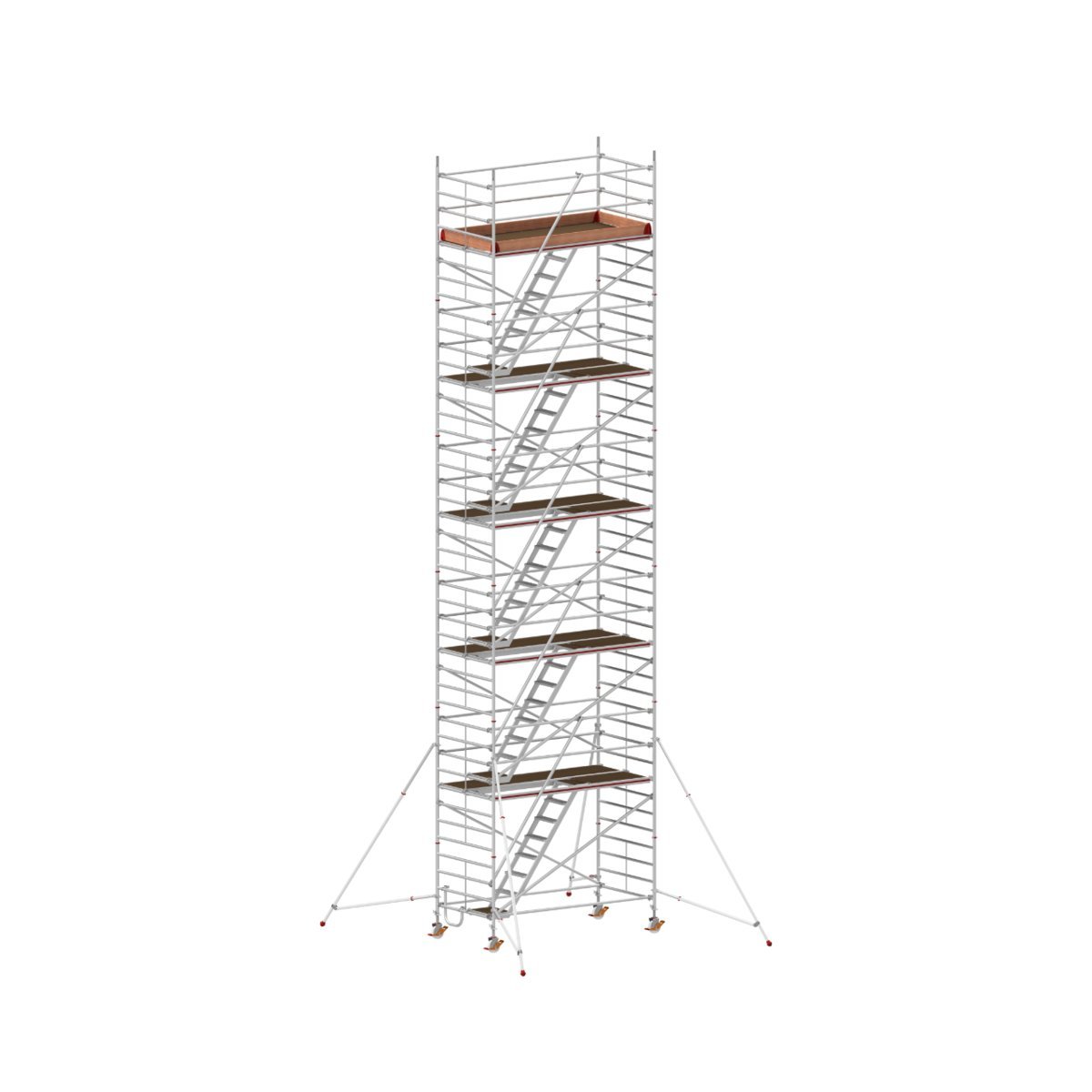 ∙ Schneller Auf- und Abbau durch massive Klickverschlüsse an Streben und Diagonalen und noch sicherer durch die in jeder Etage eingehängten Treppen.