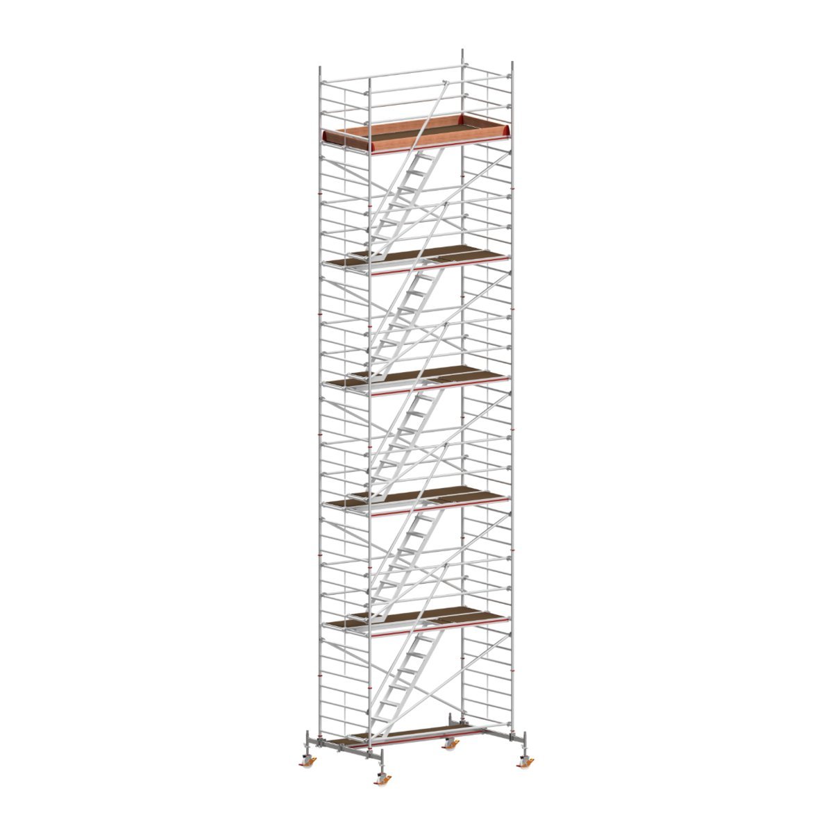 ∙ Schneller Auf- und Abbau durch massive Klickverschlüsse an Streben und Diagonalen und noch sicherer durch die in jeder Etage eingehängten Treppen.